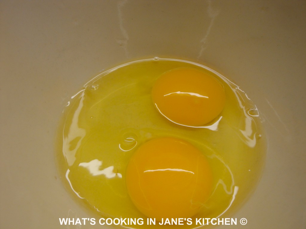 - Place two whole eggs in a bowl. Beat lightly with a fork to break up eggs.