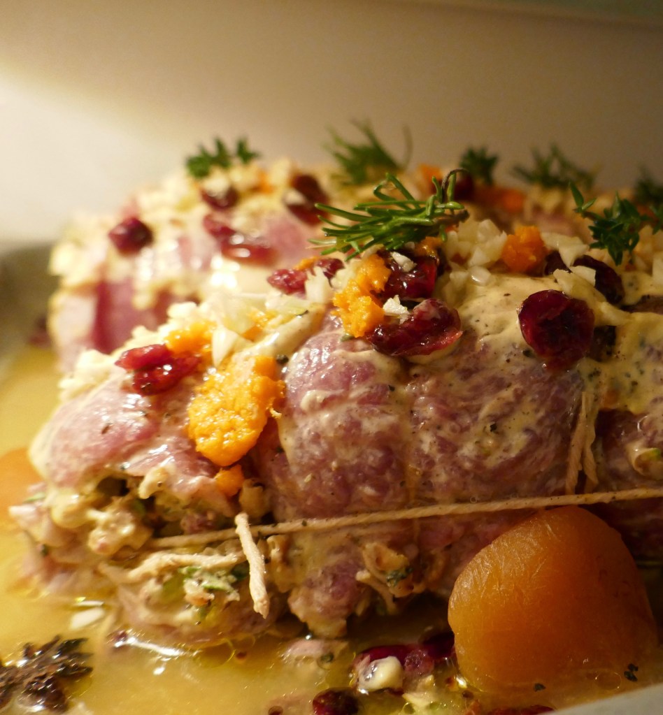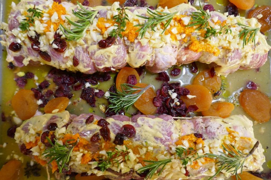 It is marinaded in orange juice, white wine and brandy and surrounded by dried apricots, cranberries and rosemary.
