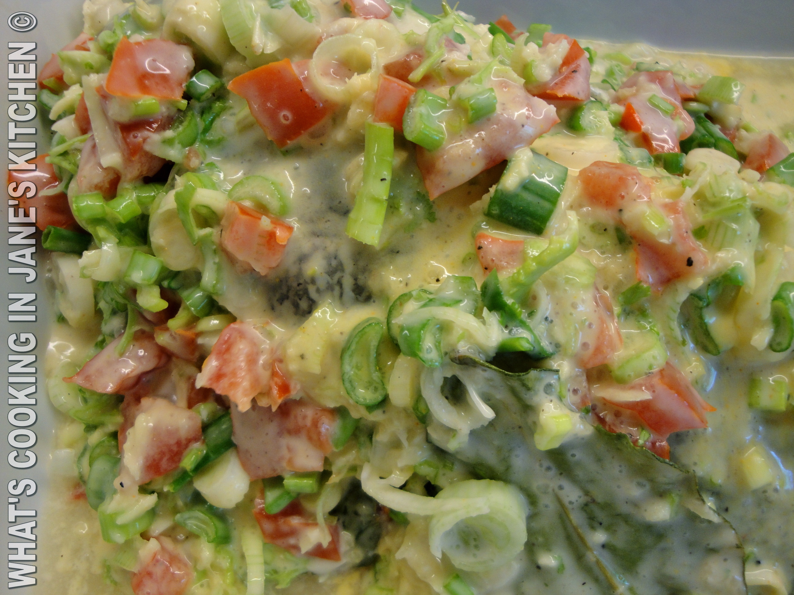 2.In a bowl, mix coconut milk, turmeric, finely chopped chilies, which you have deseeded ( wear plastic gloves and deseed under running water) chopped spring onions, diced tomato, which you have skinned , by plunging into boiling water for a few seconds, deseeded and cut into thin strips and across into small squares, 5cm by 5cm ! Then peel garlic and finely chop,peel ginger and finely grate, add Kaffir lime leaves folding in half and slicing thinly  and add pepper leaves. If you can not get lime leaves, finely grate a lime and add the juice…… better than nothing!