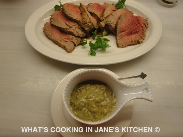 3. When Roast Beef is ready, pour juices off into bowl, ladle off extra fat and pour juices into the above sauce, mix well. It should be thick, like Mayonnaise .