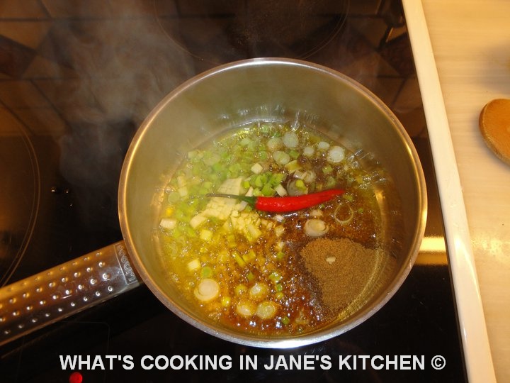 2. Put oil in sauce pan and add spices and onion, green leaves included, fry until aromatic, 2-3 mins.
