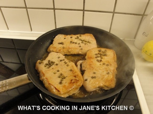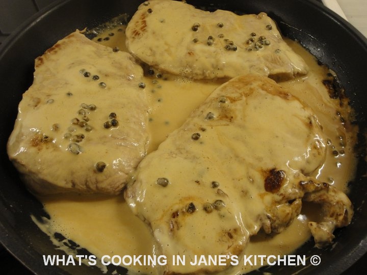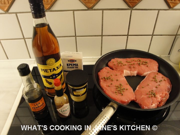 1. Place meat slices on plate and press in green peppercorns, turn over and do the same on the other side.