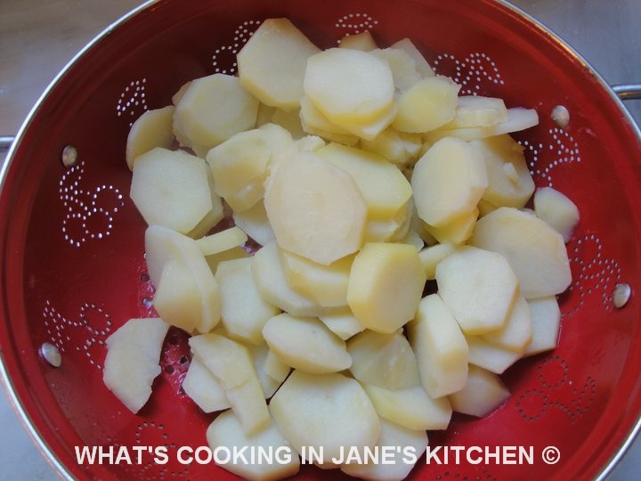 1. Peel the potatoes and slice into 1/2 cm thick slices. Place in saucepan, cover with cold water, add salt and simmer gently until just soft, approximately 8-10 mins. Test with the point of a knife. Do not over boil them, they must keep their shape.