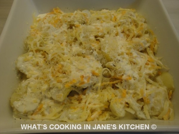 3. Sprinkle over grated cheese and pour over cream. Then add next layer of potatoes and repeat until potatoes are all used up.
