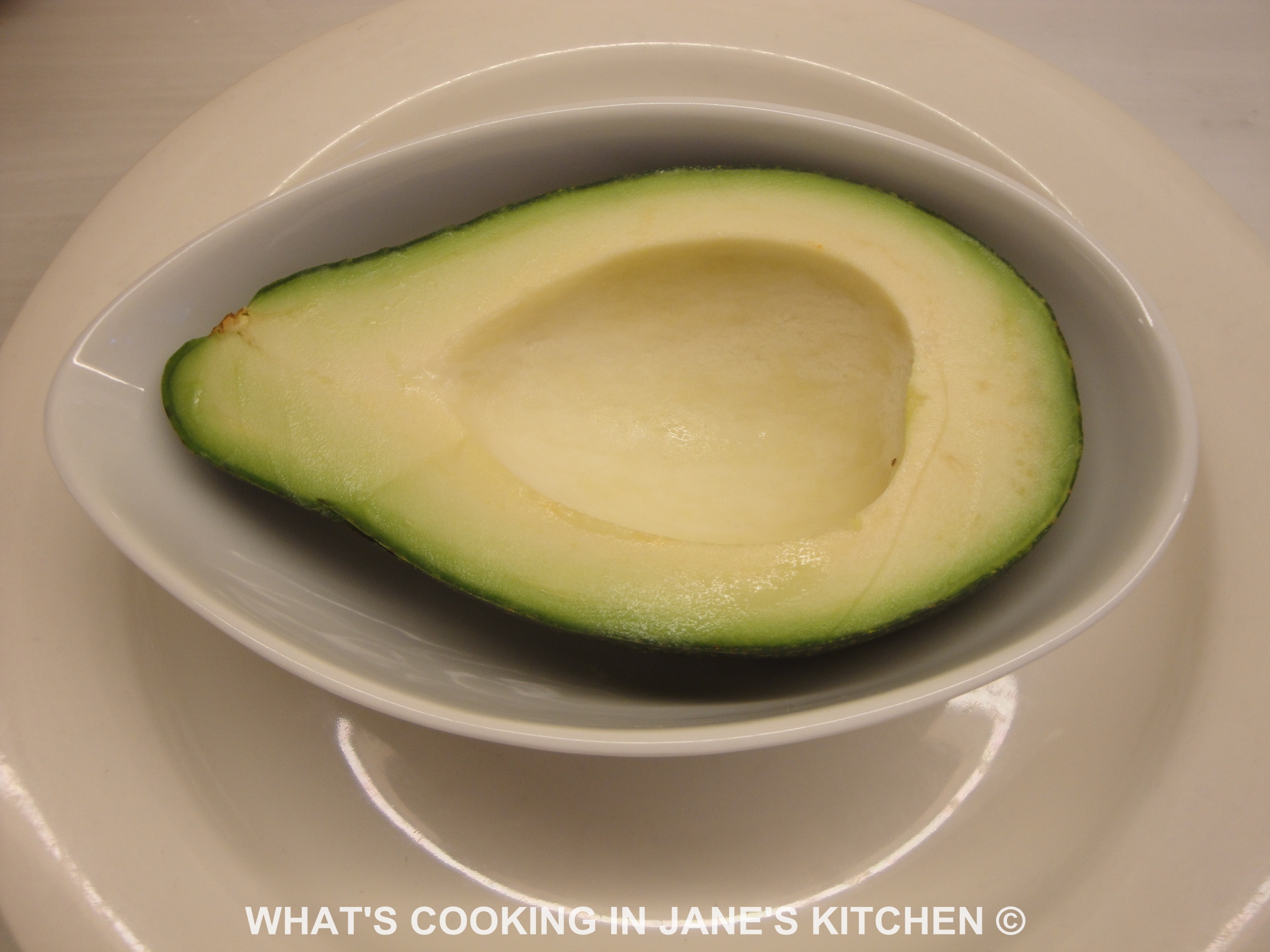 3.Half an hour before serving, cut open avocados, using a sharp knife and cutting round long ways through to the stone and prize open with the side of the knife. Remove stone by sticking knife into stone and extracting it from the cavity.