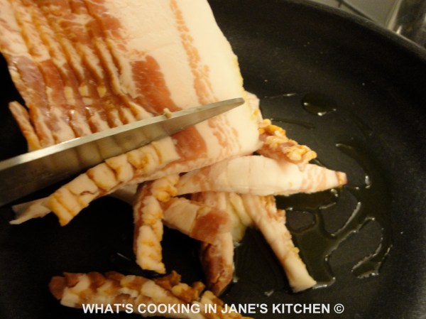 2. Place olive oil in frying pan and add bacon cut into “Lardons.”