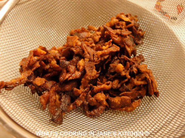 Once it reaches the right color, place sieve over heat resistant bowl and pour bacon into sieve.