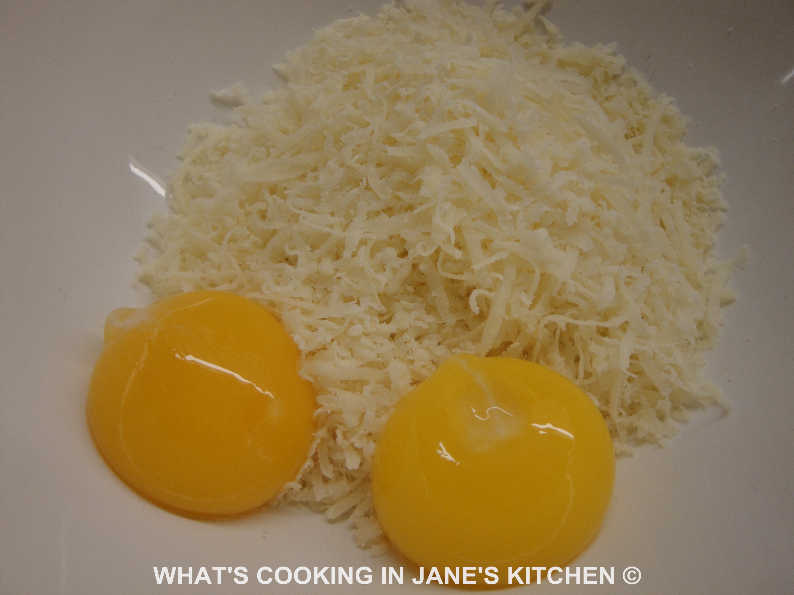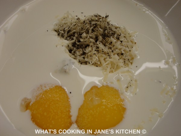 4. In a bowl, grate parmesan on fine grater, add egg yolks, cream, salt and pepper.Mix well.