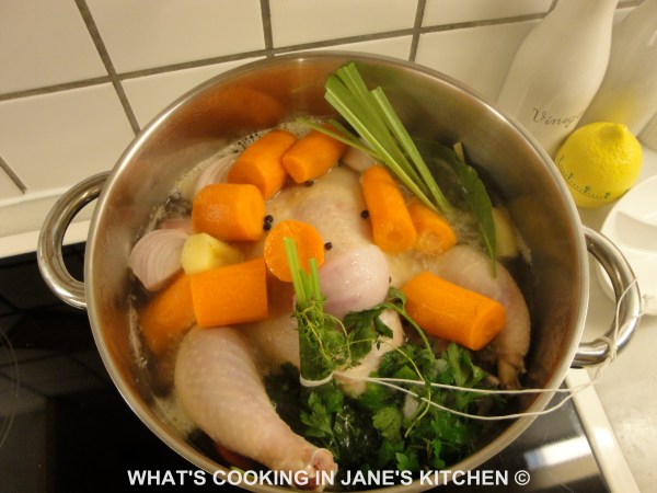 1. Prepare your chicken stock the day before in the usual way. ( 1 chicken, enough water just to cover, 2 carrots, 2 leeks, 2 onions celery, 6 black pepper corns, 1 tsp salt, Bouquet Garni made from fresh parsley, bay leaf and fresh thyme. Boil gently for 1.5 hrs, test with skewering thickest part, that it is completely cooked. Pour stock into a bowl, passing it through a sieve, leave to cool and then chill in fridge. Next day, using a slotted spoon, skim off the fat, which has solidified on top of your stock and the stock is ready to use. This is a good tip, because especially when making a cold soup, you want the final result to be smooth, something it won’t be if there is too much fat content.