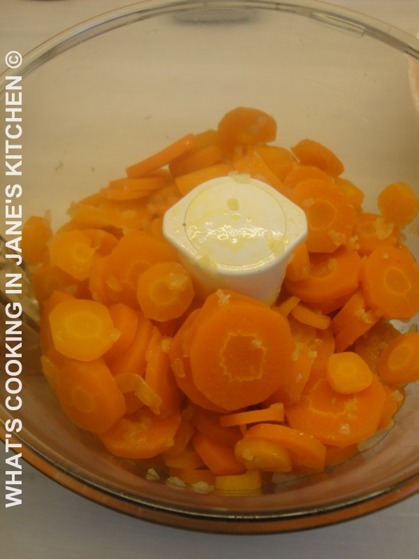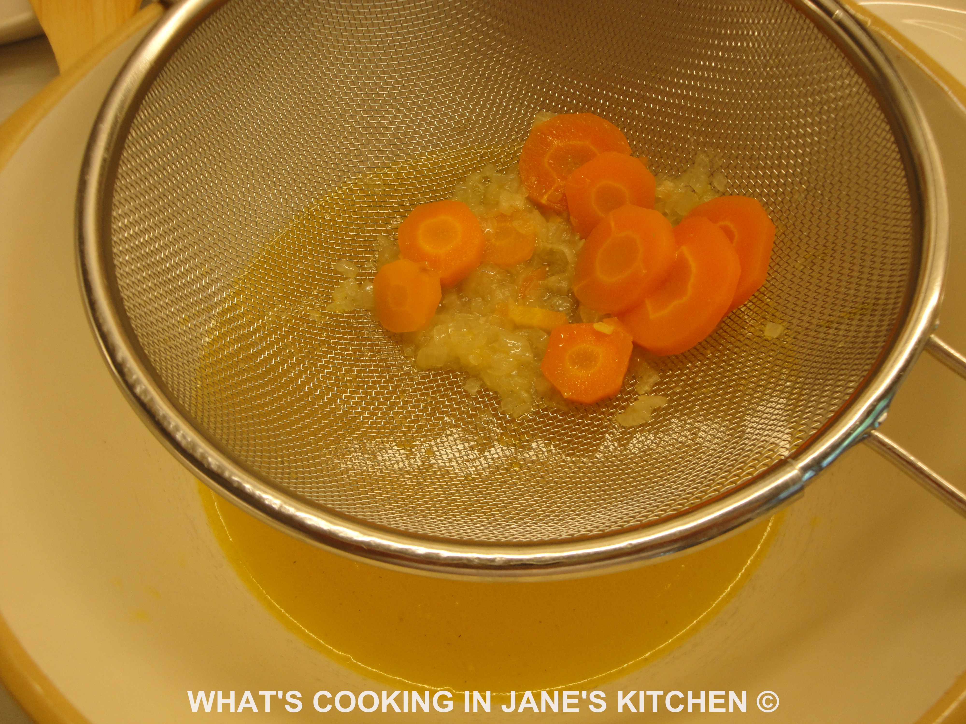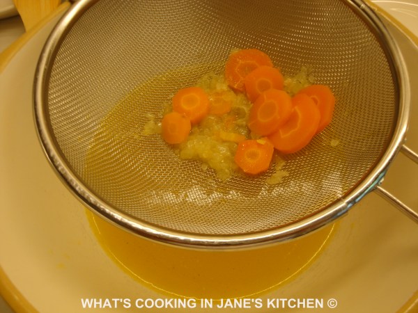 5. Remove from heat, cool a little. Pour off liquid into a bowl and reserve. Blend carrots thoroughly until really smooth. 2-4 minutes in blender.