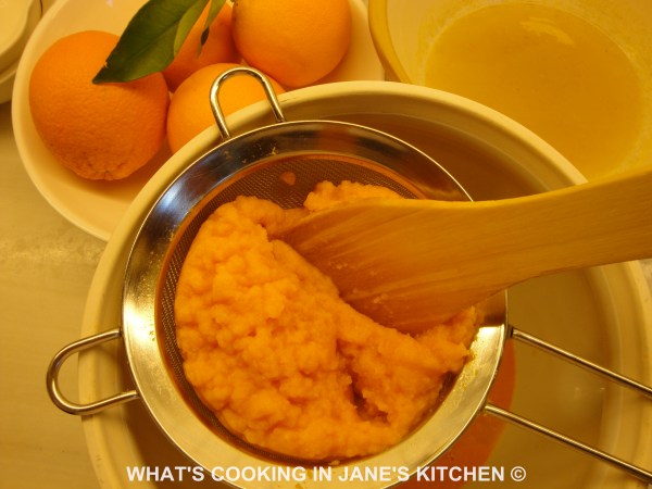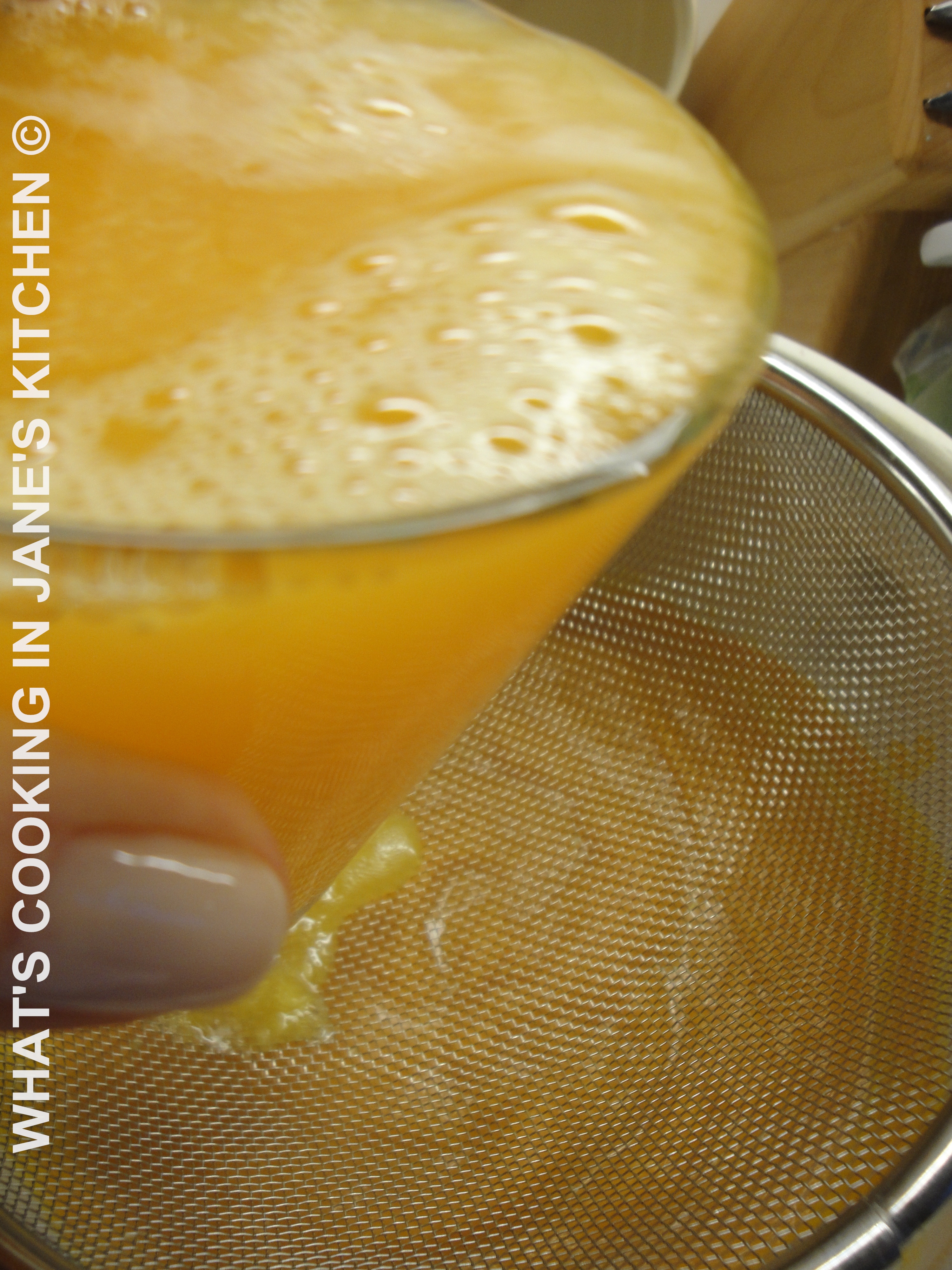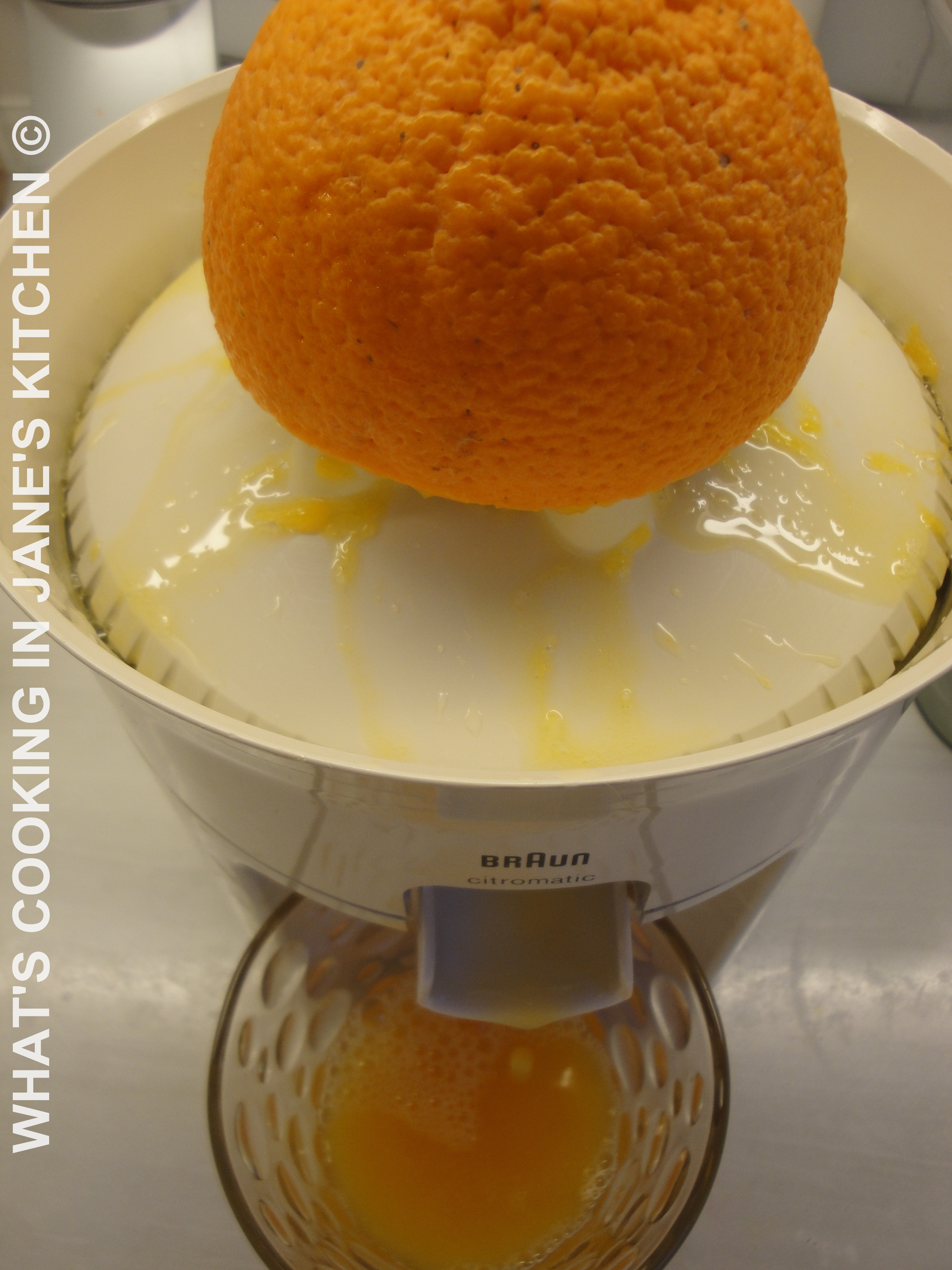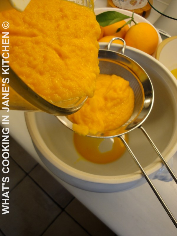 8. Half an hour before serving, first squeeze and sieve your orange juice. (This can not be done too far ahead, or orange juice becomes bitter.) Add orange juice to your soup and then add some of the stock, until you get the consistency you want. Keep it a little on the thick side, until you have tasted it, as it may need more orange juice. It needs to have a definite orange flavour. The final thickness should be like thick cream.
