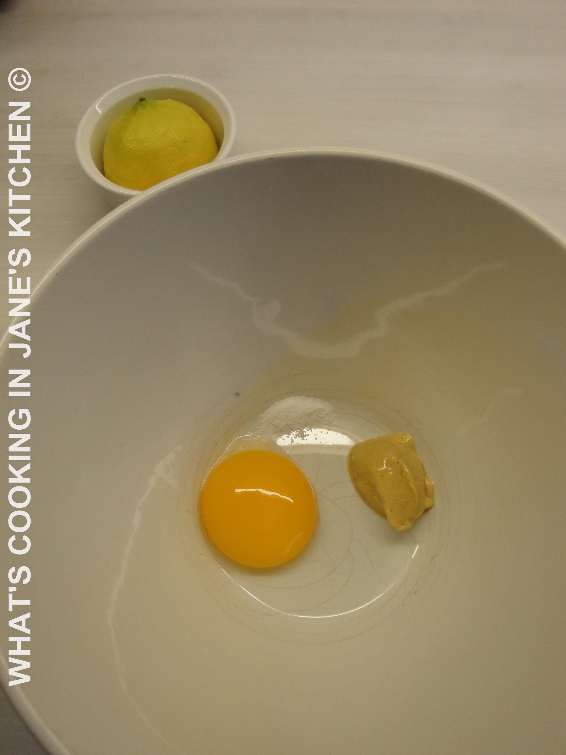 5. Prepare the Mayonnaise, by placing egg yolk, salt pepper and mustard in bowl.