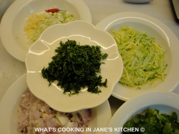 Prepare all ingredients.Left to right, garlic, chili and spring onions. Grated Courgette/Zucchini. Mint.