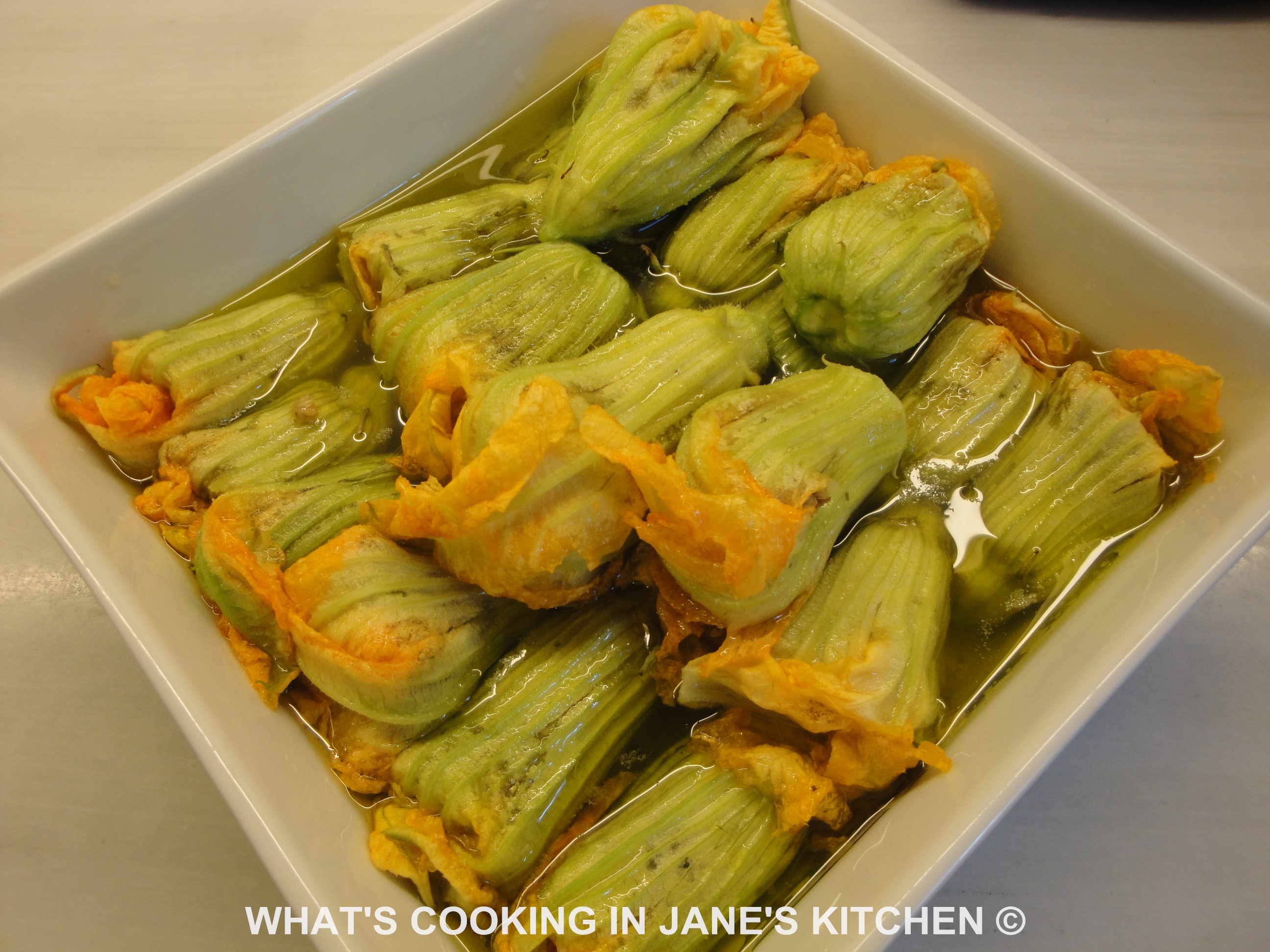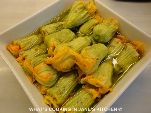 6. Using a tea spoon fill each flower 1/2–3/4 full and fold over petals. Lay on their sides in oven proof dish, packing them closely together.
