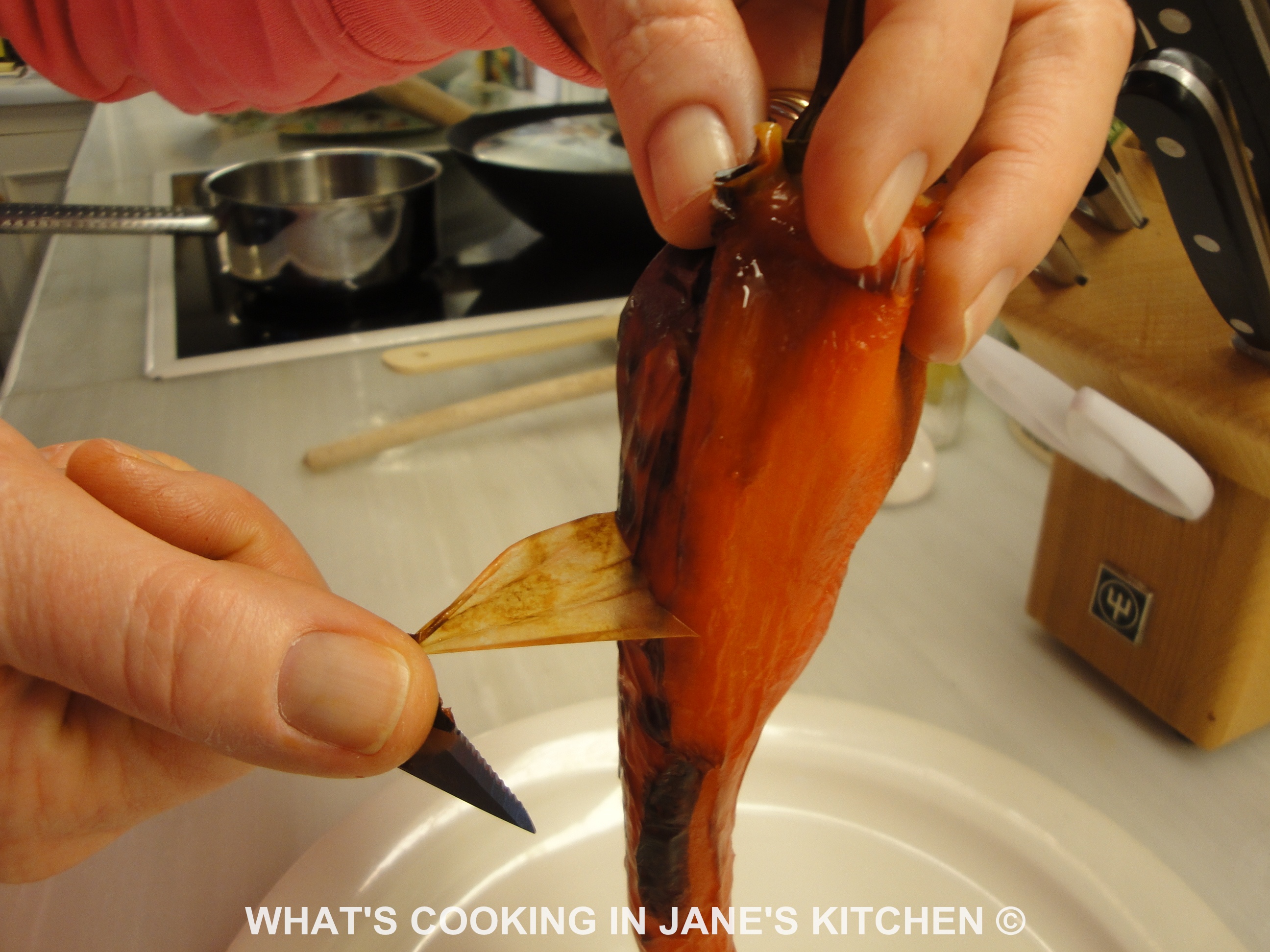 4. Remove skin with sharp knife, cut open and remove seeds and stalk.