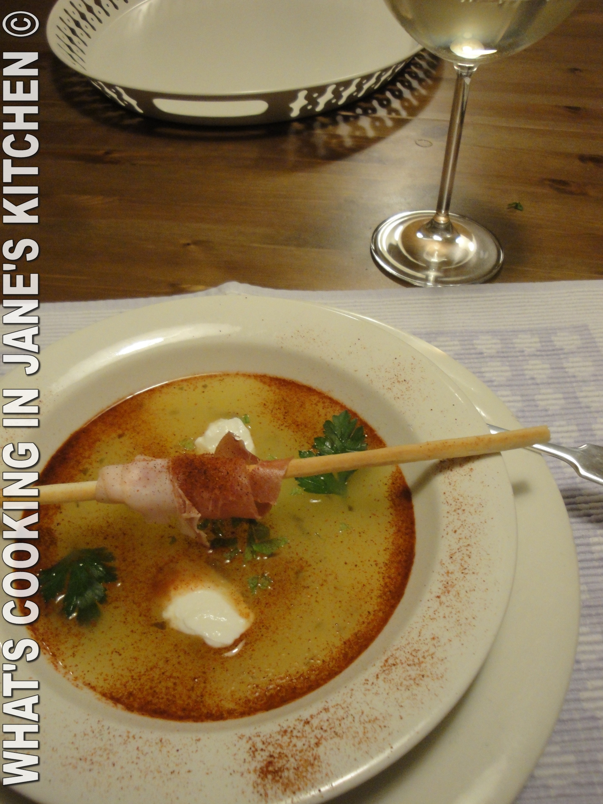 8. Five minutes before serving, wrap prosciutto around grissini. Place across soup bowl, decorate with parsley leaves and spoon in two tsp of thick yogurt, extra finely chopped mint and melon cubes. Dust with “Sweet Paprika” using a small sieve.