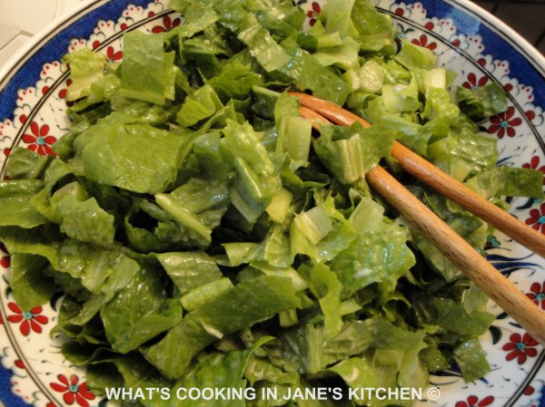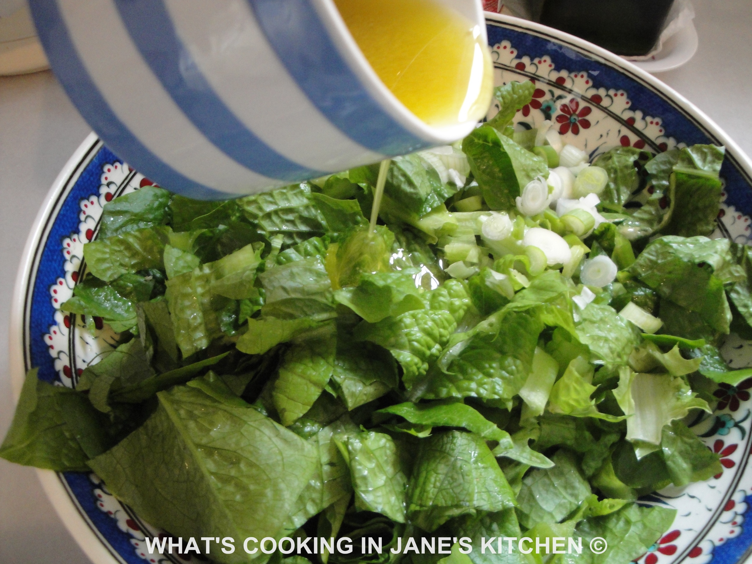 Just before serving, not earlier, or lettuce wilts, pour over salad dressing.