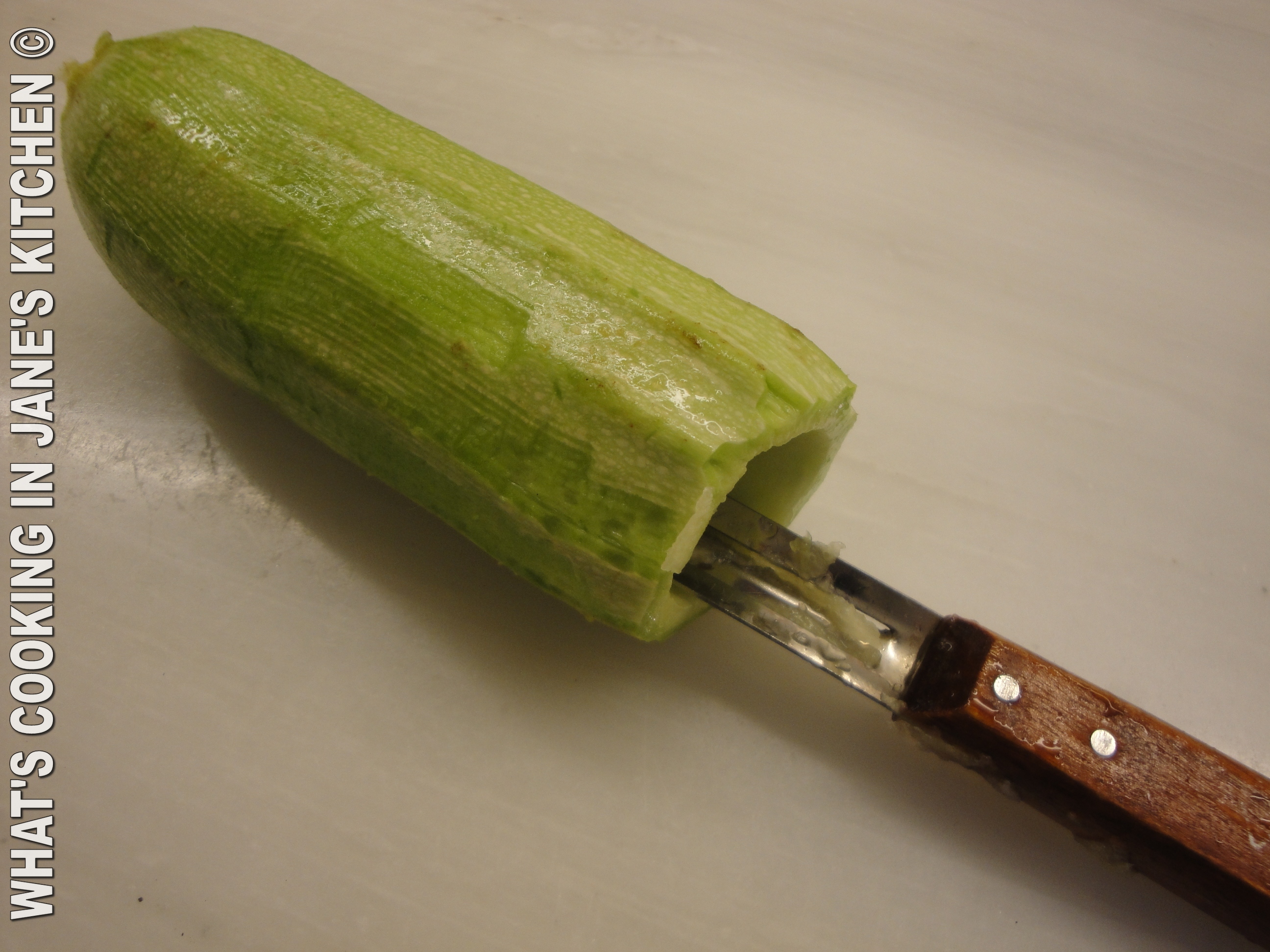 3. Using a potato peeler, or special corer, remove the inside pulp of the courgette carefully, so as not the damage the out side. This is not difficult, just requires a little patience. Discard pulp.