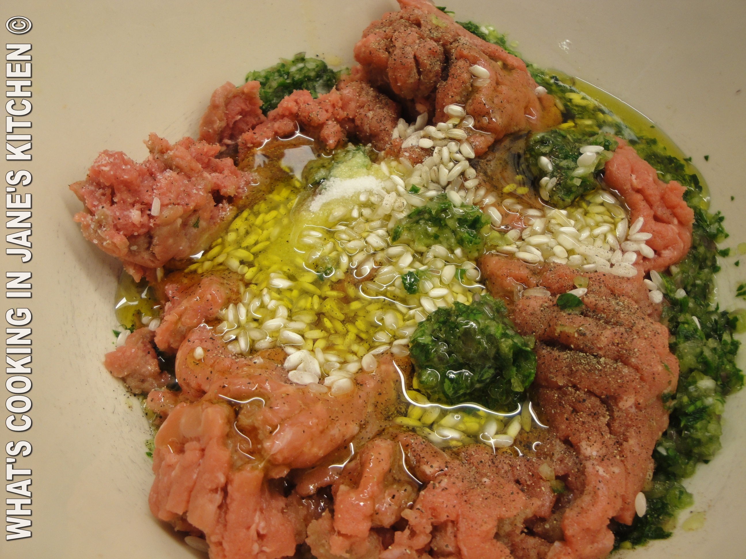 Put the ingredients for the stuffing into a bowl and mix together. Here you can see the pearly rice required.