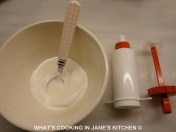 Before beginning, whip up your decorating cream in a separate bowl, reserve in fridge.