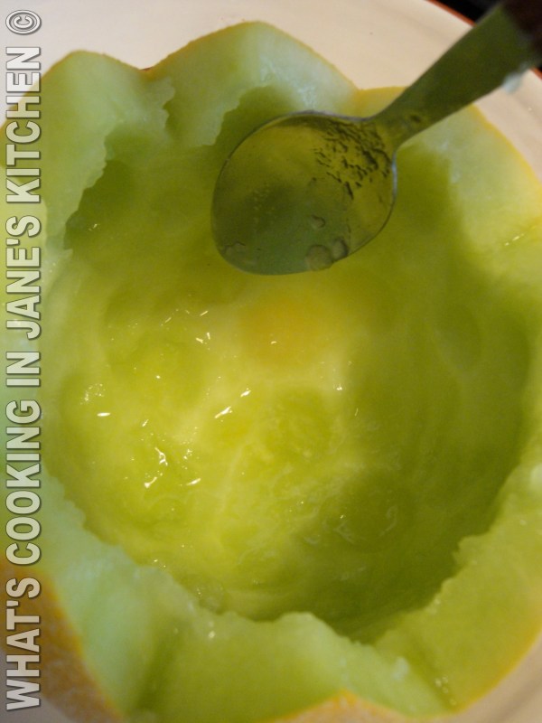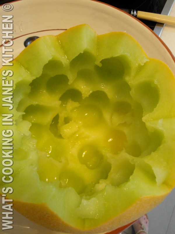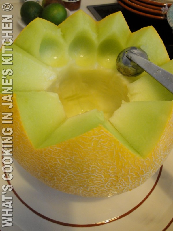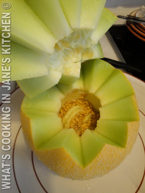 3. Wash your melon and trim the stalk neatly. Selecting a sharp serrated knife begin by making your incisions 2/3rd of the way up the Melon, stalk end upper most, so that your melon sits firmly on your serving dish. Your incisions can be as small or as big as you like, I made mine rather large as I was in a hurry! As you cut, make sure you are cutting through to the cavity of the melon, so that the lid comes off neatly, about 2 cm depth. Try to cut around in an even horizontal line.This is not difficult, like all things, the first time you will have to think, but the second time round, it is easier.