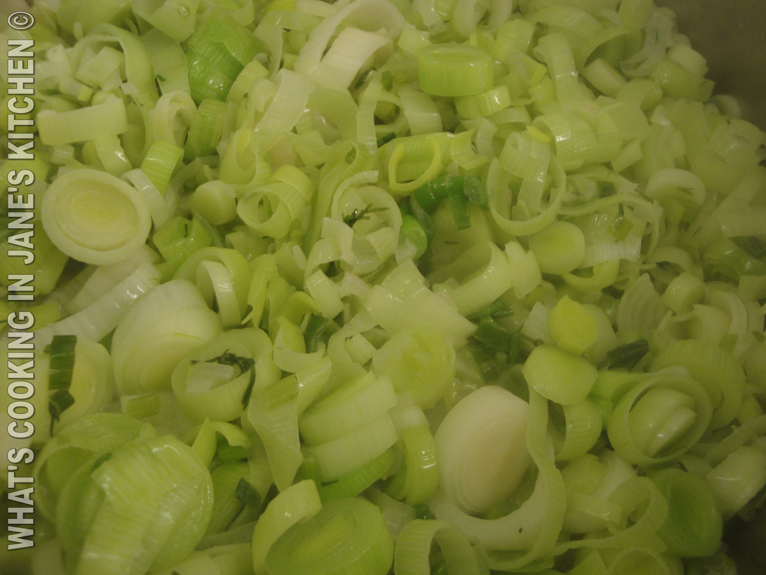Add sliced leeks and sweat over a low heat, lid on. Stir from time to time as the vegetables must not brown.