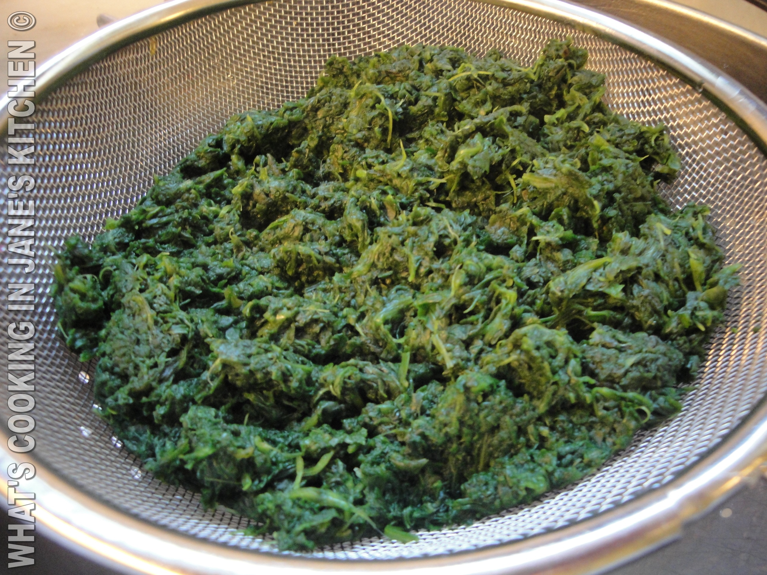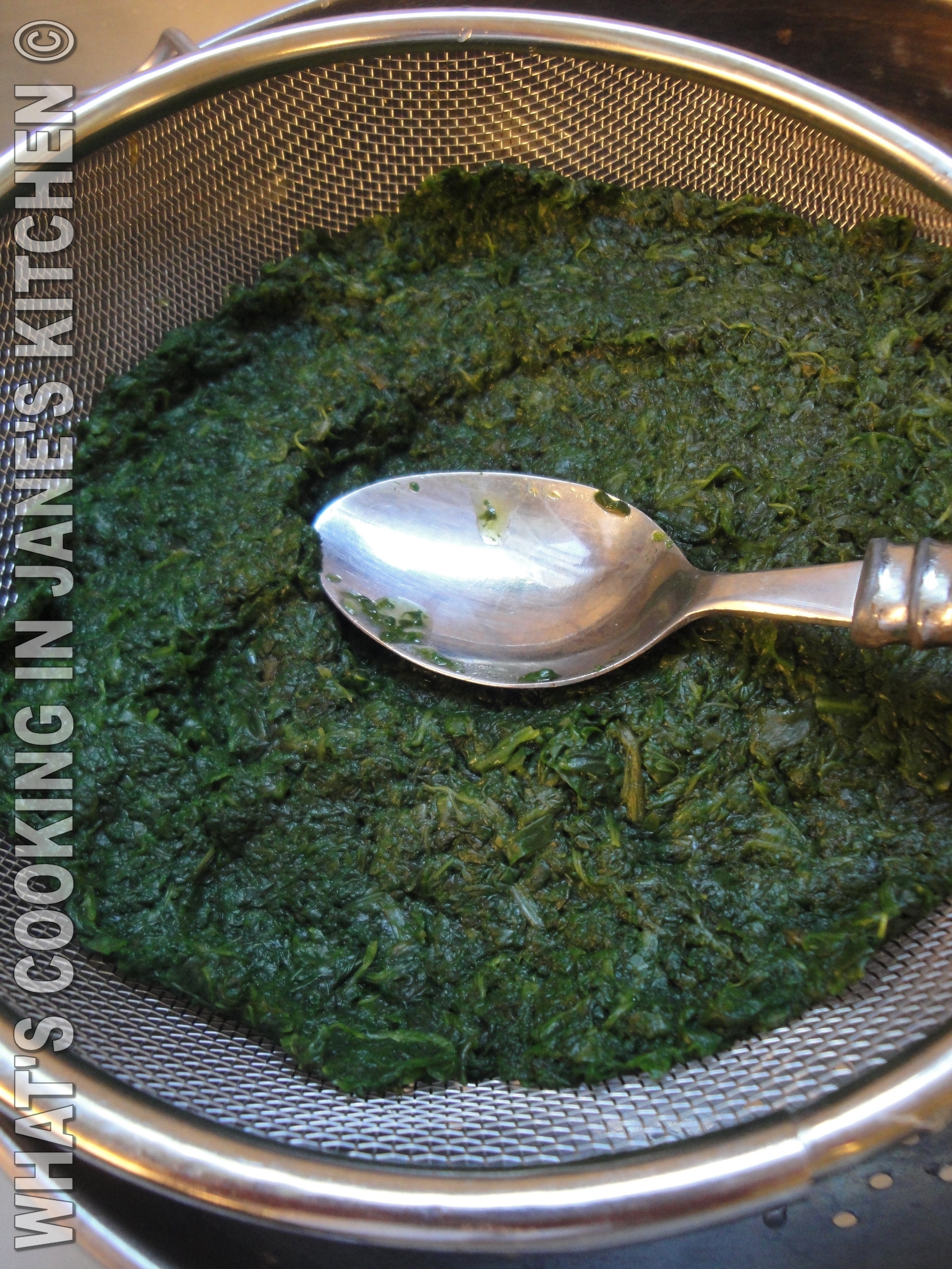 4. Place spinach in colander and press water out with a spoon. This is important, you don’t want a watery pie.