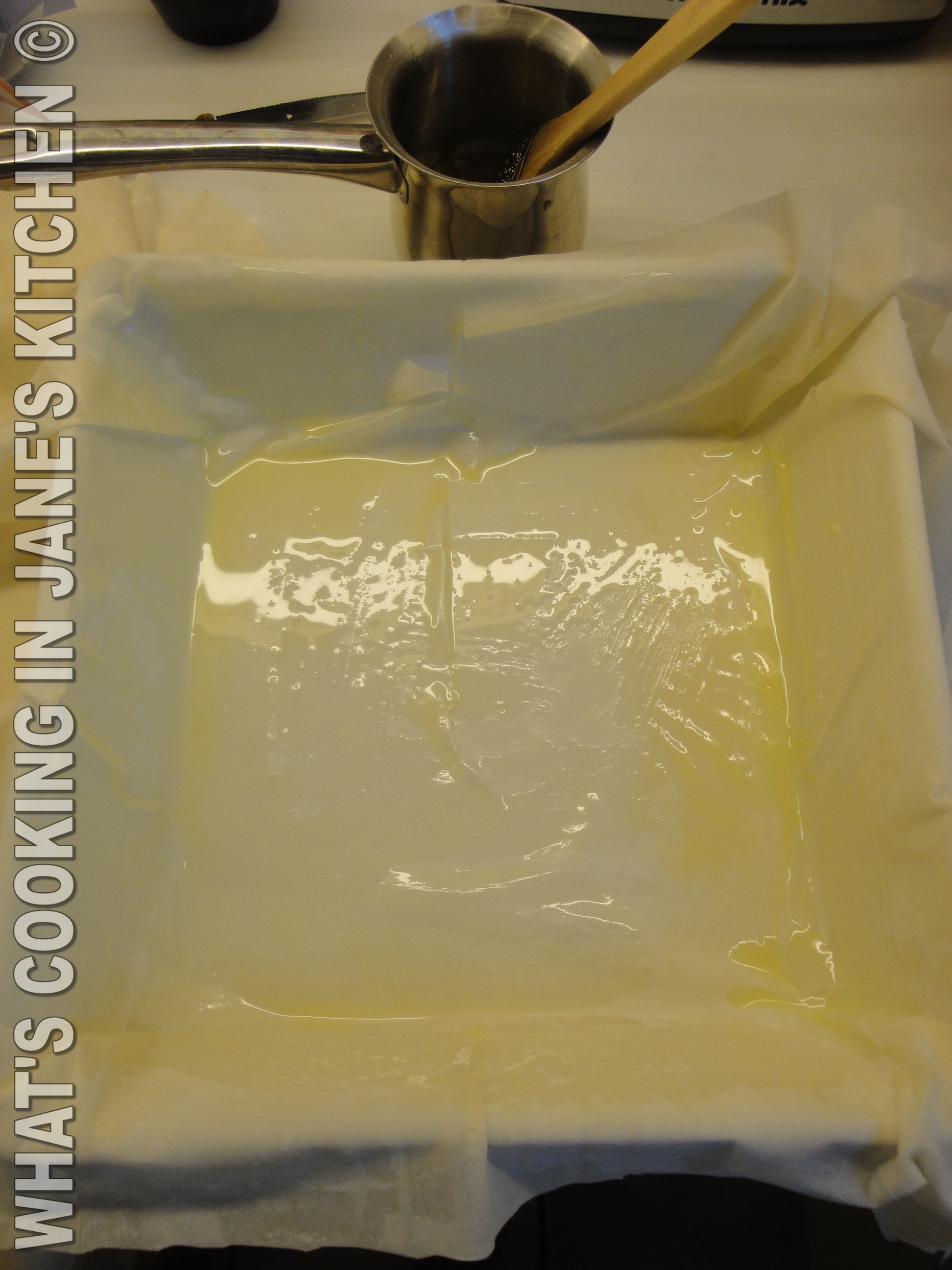 9. Butter thoroughly on top, tidy your dish with kitchen paper and using a very sharp serrated knife divide pie into squares, according to the size of your dish. It is nice if the pieces come out about  5 x 5 cm squares. My pie dish was 24 x 24 cm. If you choose a larger pie dish, the pie will come out thinner, which is also very nice.