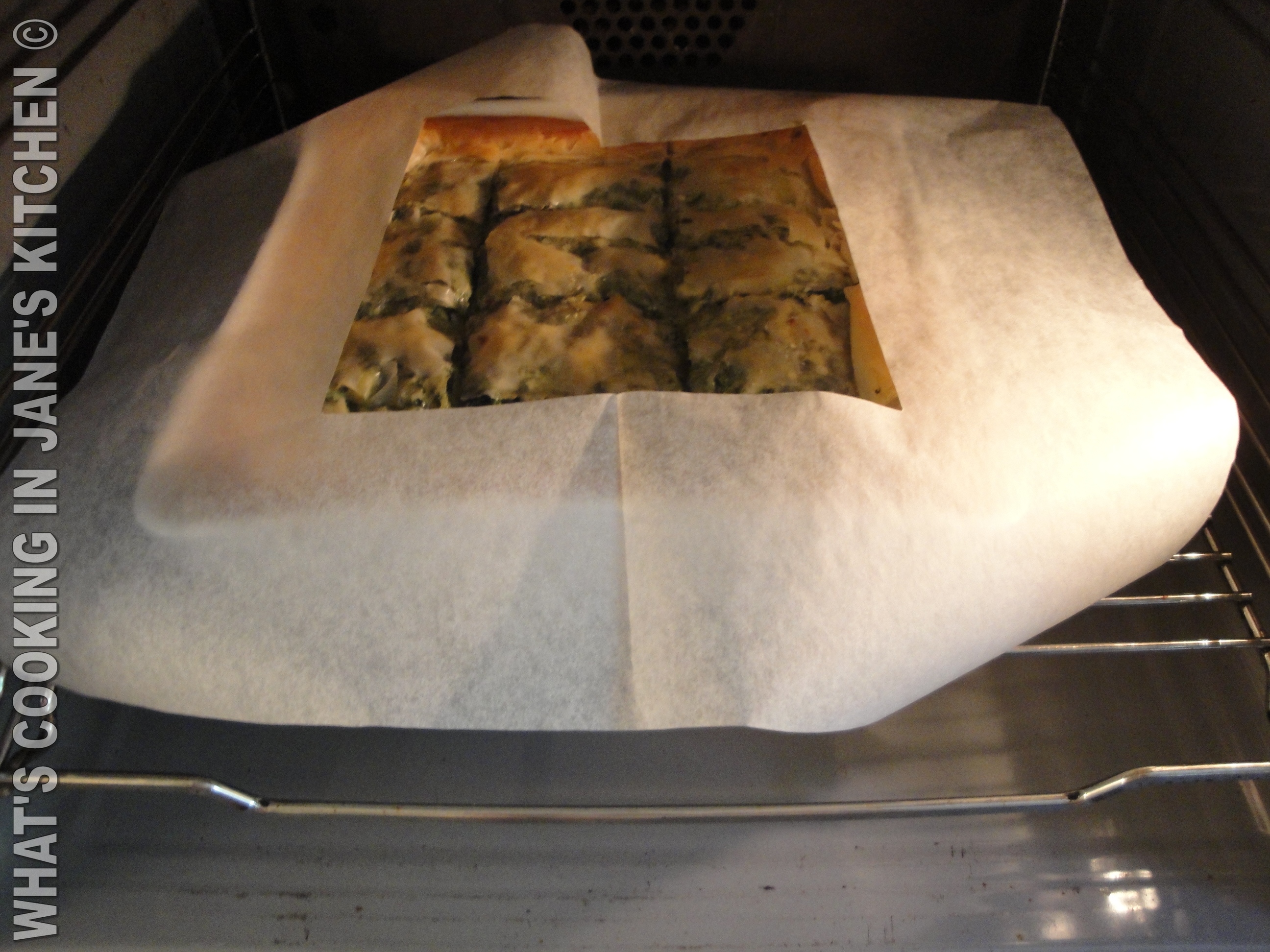 10. Place in center of oven, at  200. C. for 3/4-1  hour, or until the pastry is uniformly golden. If pastry browns too quickly, cover lightly with a sheet of tin foil. Or as I did I made a specially shaped protection, because the outer browned before the inner! Filo may seem an easy pastry, but it too needs careful cooking to get the correct crispiness.
