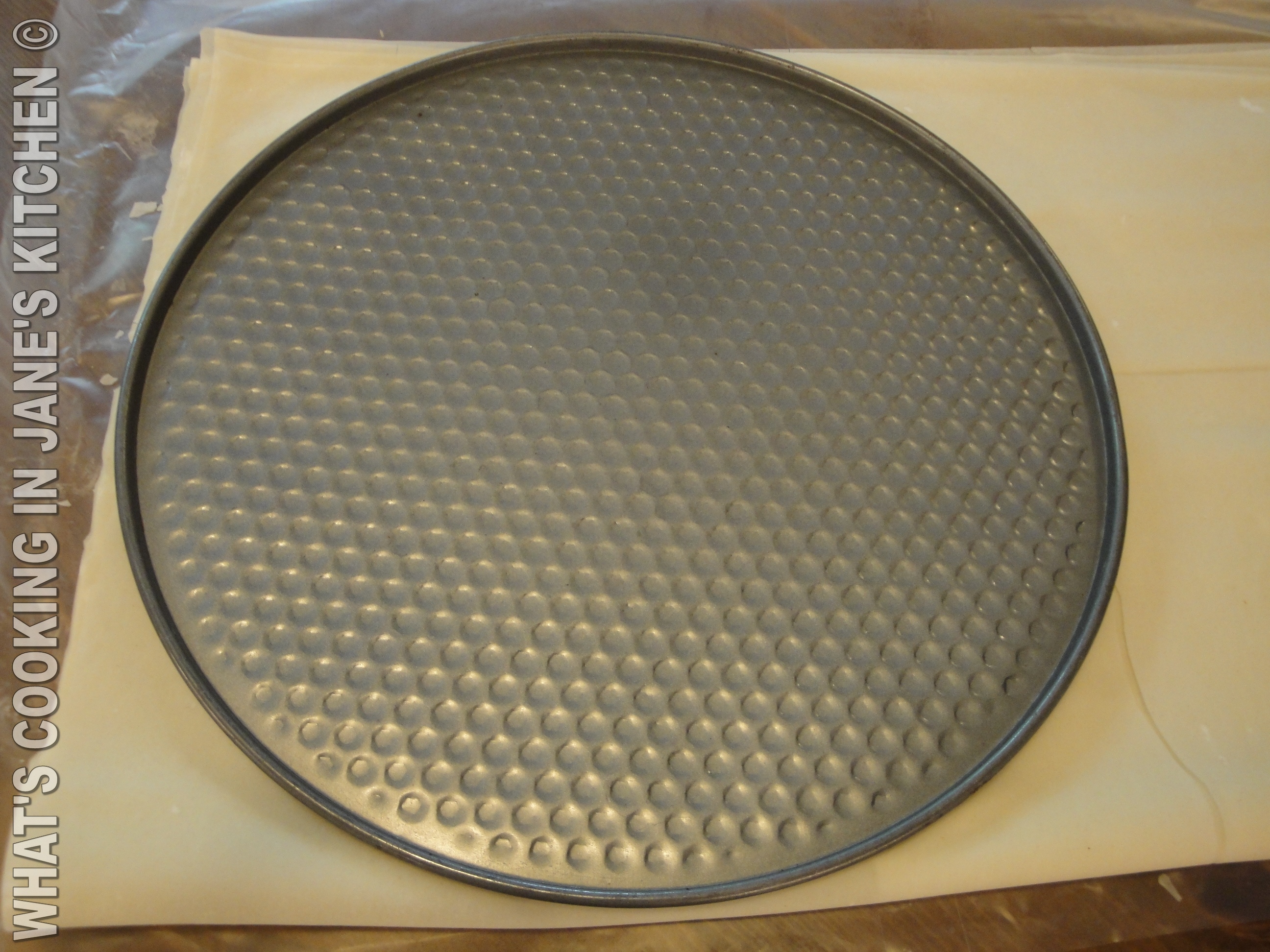 2. Unravel your Filo pastry and put to one side three sheets.( Put rest away. ) Fold your three sheets in half and using a suitable round, 22 cm in diameter, cut round with scissors and quickly butter the layers before they dry out, starting from the bottom one and adding the layers one by one. See pictures.