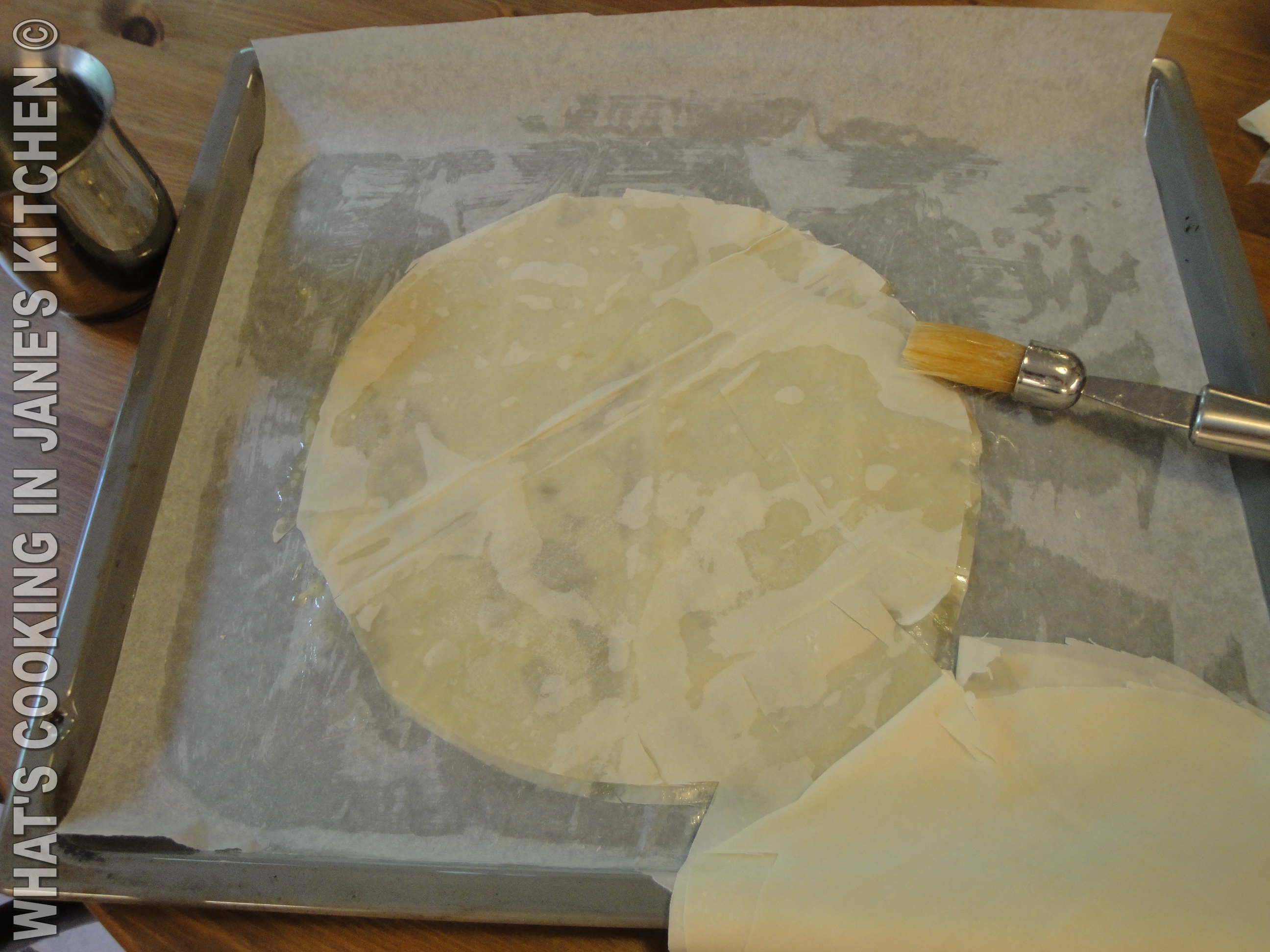round with a pair of scissors and quickly butter the sheets of Filo, using pastry brush.