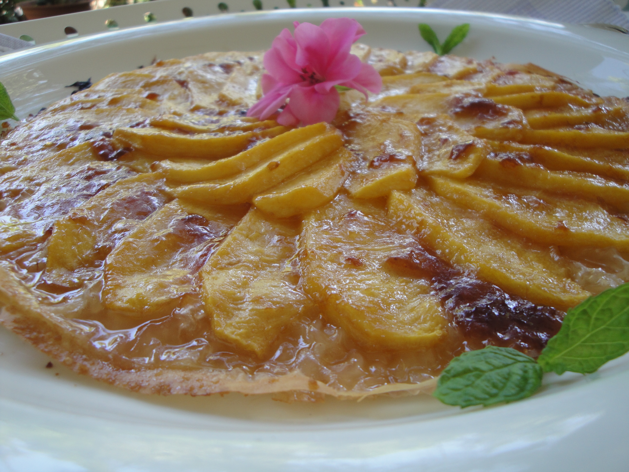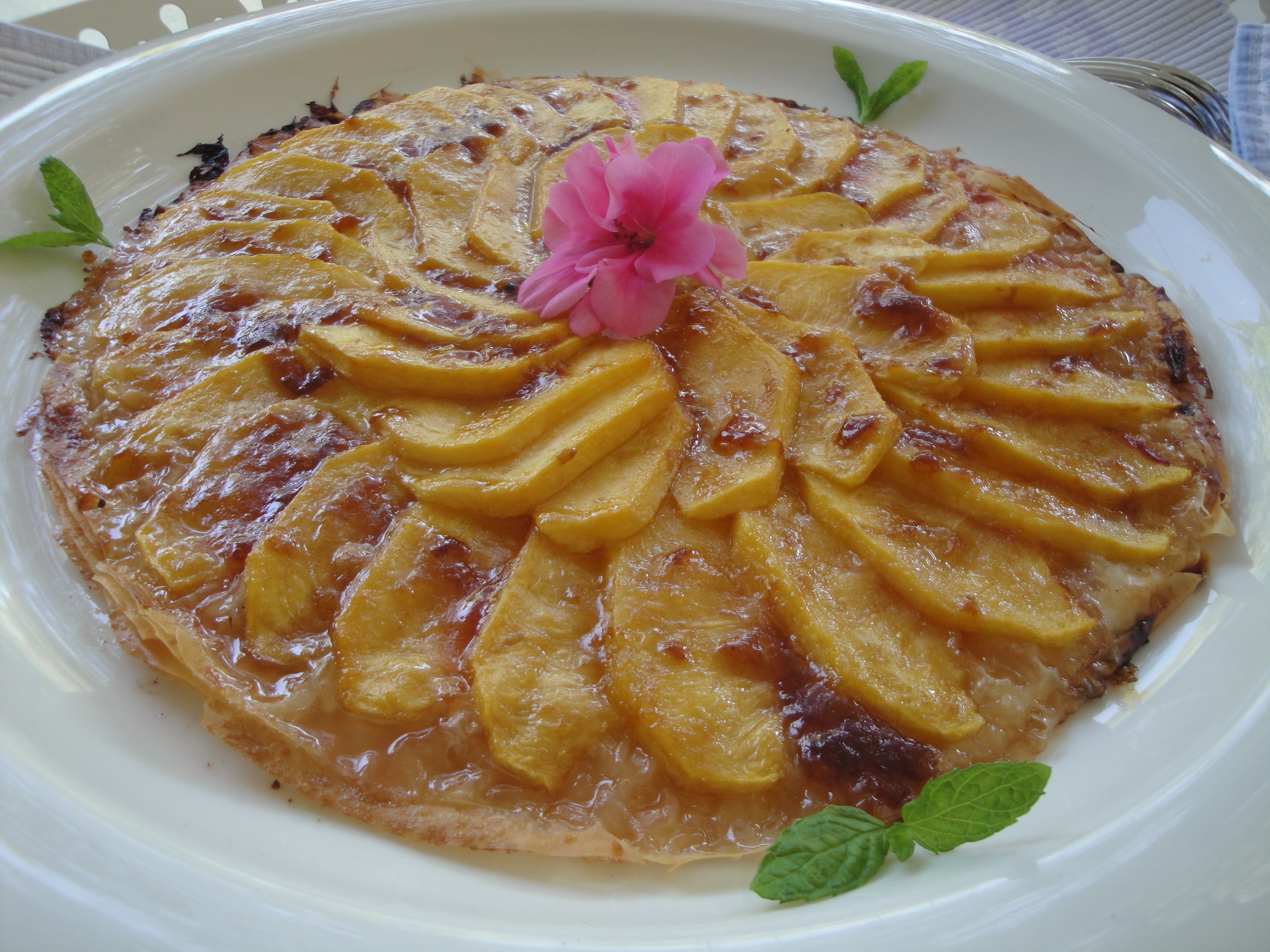 5. Sprinkle your peaches only, not the pastry, with sugar or if available, wonderful “Canadian Maple Sugar.” Important : With a sharp knife knock up the pastry, by gently knocking into the sides of the pastry to slightly separate the sheets of Filo all around the sides. Finally brush with apricot jam to glaze your “Galette.”