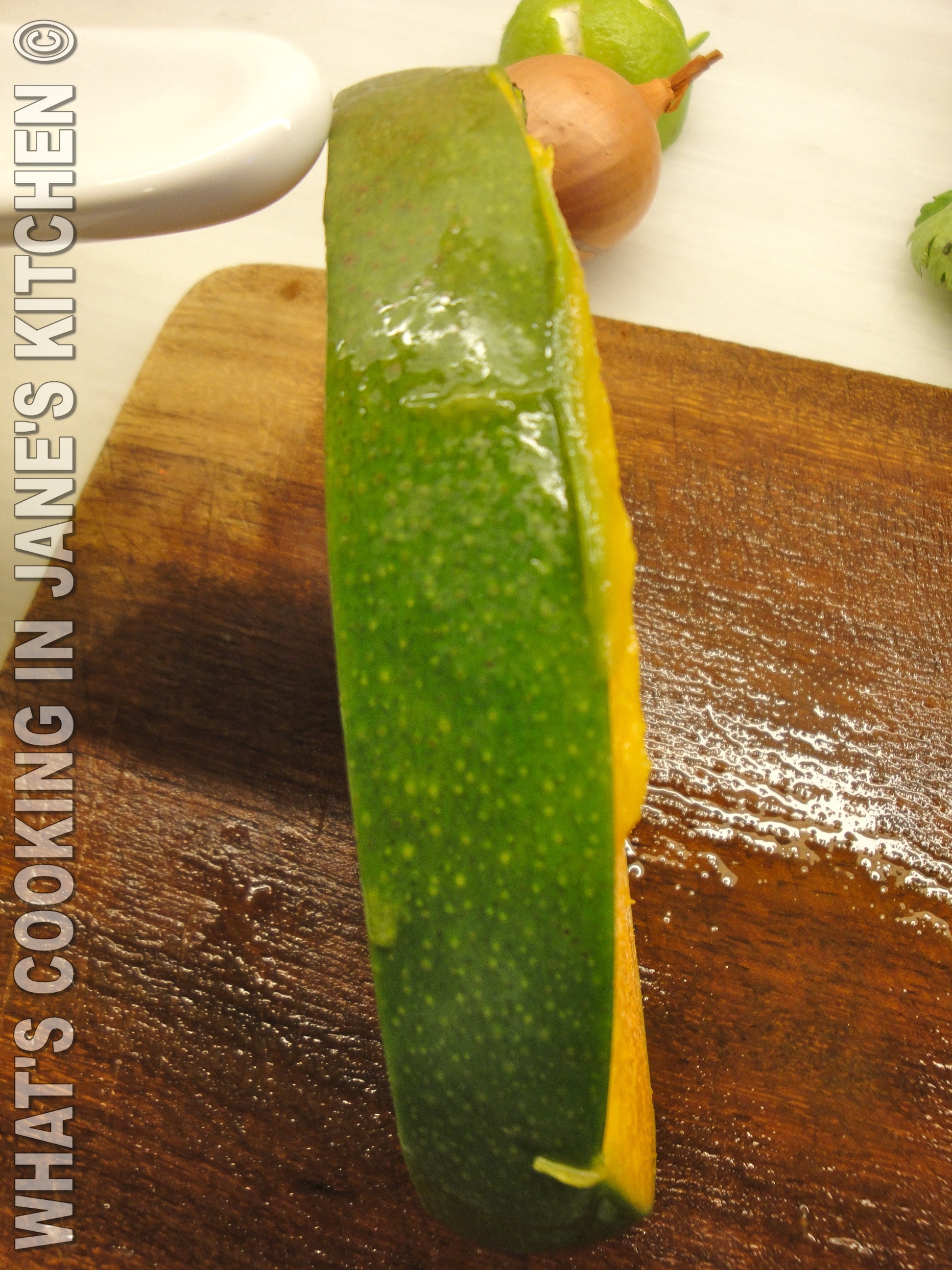1. Wash and cut open your mango. To do this hold the mango in front of you long ways, i.e. stalk end nearest to you. It is from one end to the other that the thin seed lies, about 1 cm in thickness. Make two long ways cuts, leaving a 1 cm gap between them and cut through, as if you are cutting off the two cheeks. See photograph.