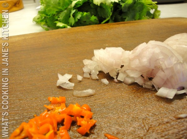 3. Add finely chopped onion and chili ( seeds removed , slit open chili longways, holding the stalk and under the running tap, scrape out seeds with the sharp point of a knife. I do this with the window open as the chili can make one cough, or I hold my breath! so do it quickly! Try to avoid touching the read part, or wear gloves.)