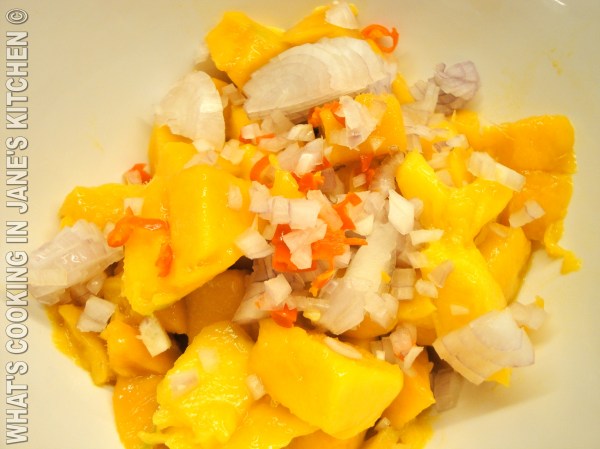 Mango, finely chopped onion and sliced red chili. The red chili, gives it a nice color as well as heat!