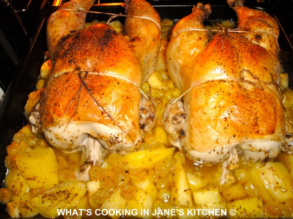 8. Place in pre-heated oven, 250.C. and cook for approximately 1. 1/2 hrs or until the juices run clear, when you pierce the thigh, with a sharp knife. Once the breast browns, turn the chicken over, or cover lightly with tin foil.
