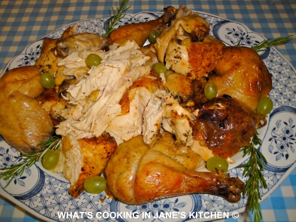 12. Remove potatoes and grapes with a slotted spoon and serve around chicken, or separately.