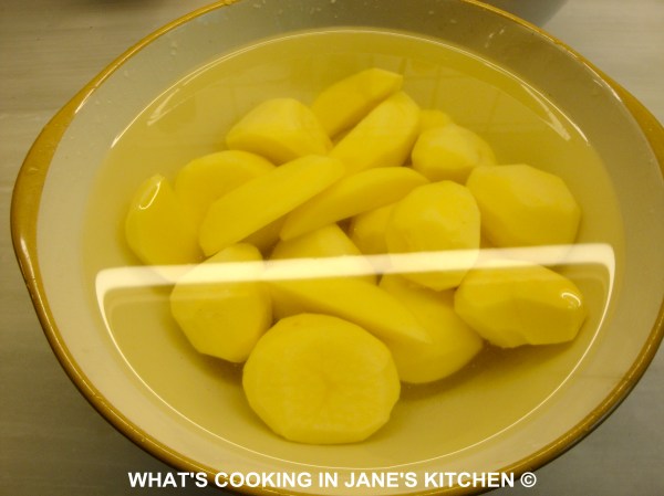 Peel potatoes and have them ready soaking under water, so that they do not brown. Just before adding to