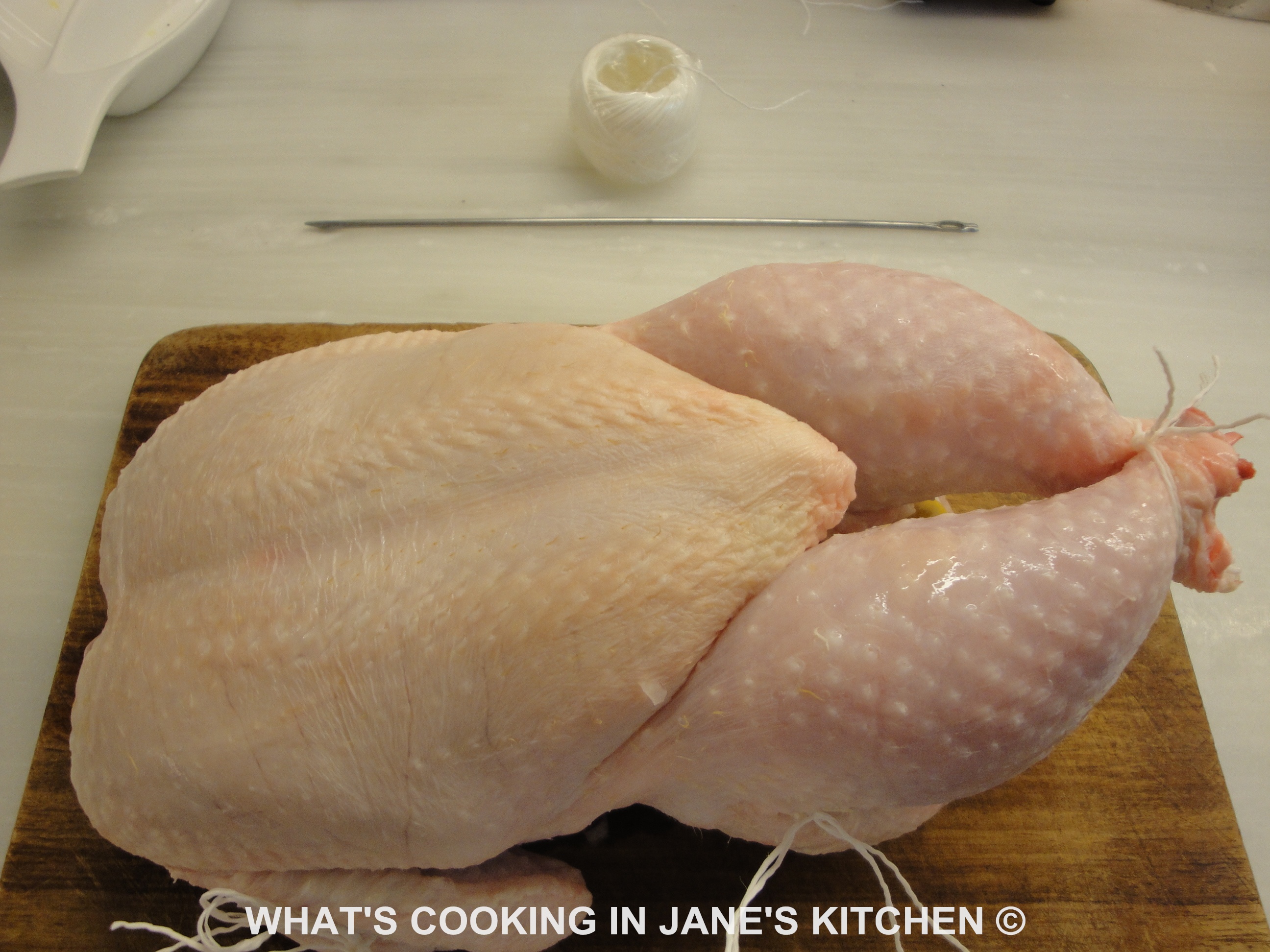‘Trussed’ Chicken….see “Cooking Procedures” in Index to learn to do this, or simply tie with string as shown