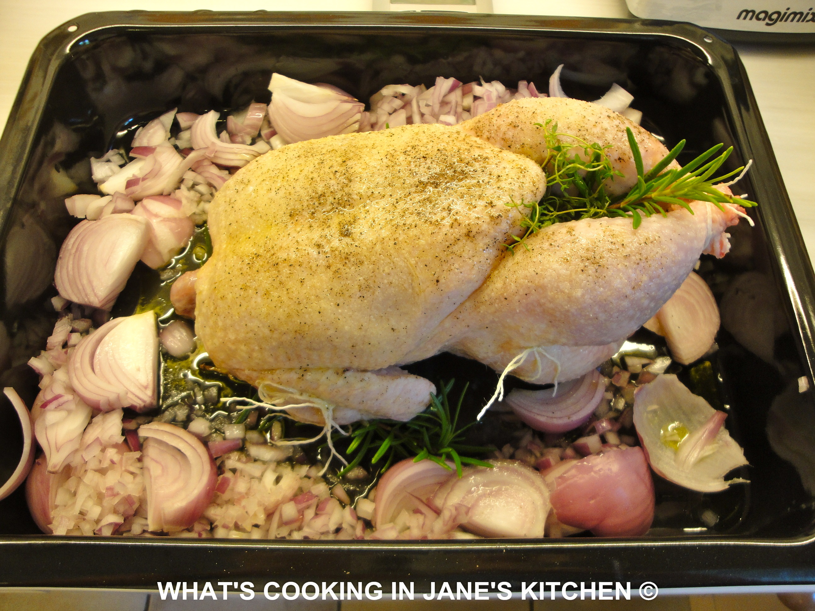 Here is the chicken in the roasting tin surrounded by chopped and quartered onions, I had a few extra and