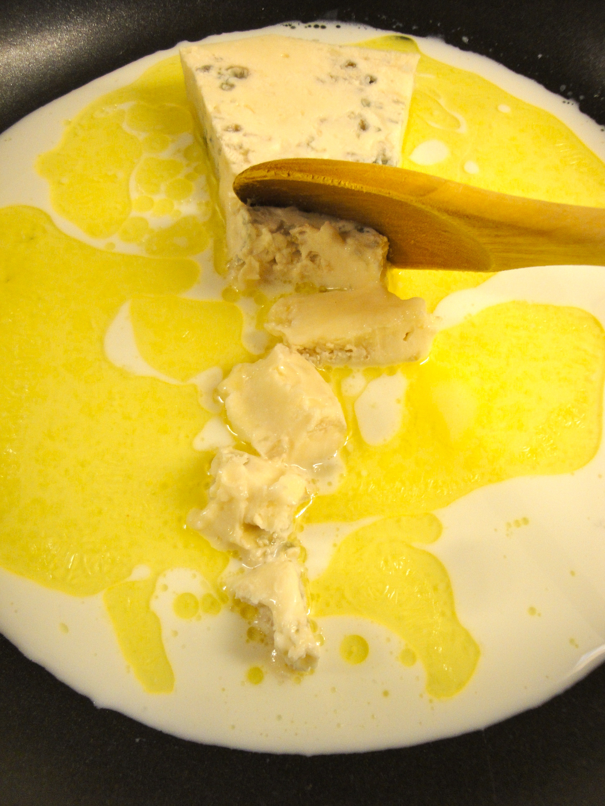 Over a low heat break up the gorgonzola with a wooden spoon, until it has melted completely and formed