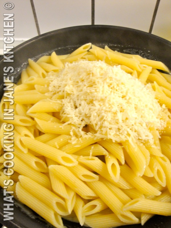5. When the pasta is cooked ‘al dente,’ drain and transfer to the pan with the sauce. Turn heat onto low and toss the pasta over the heat with the sauce and the grated parmesan for about 30 seconds.