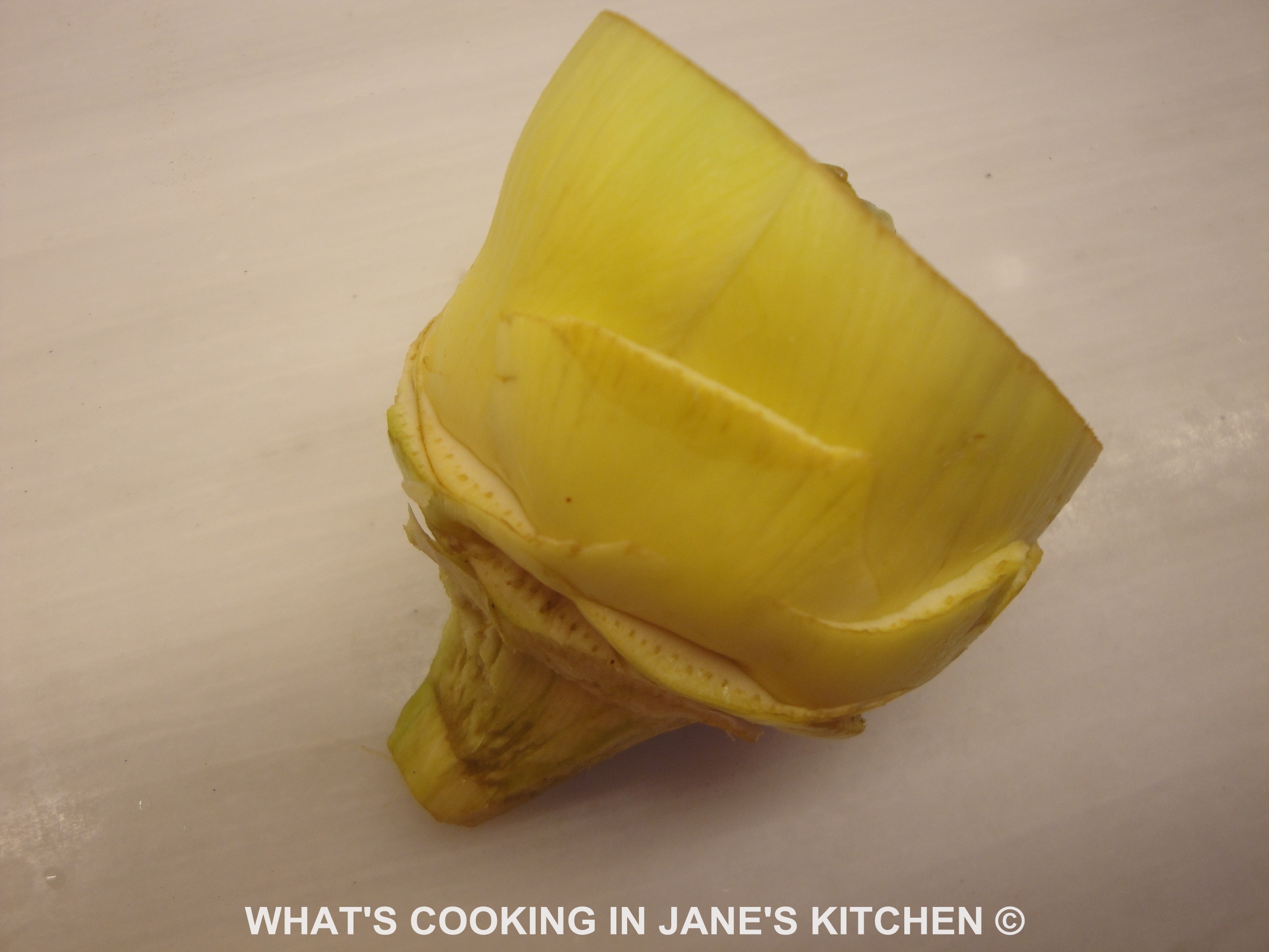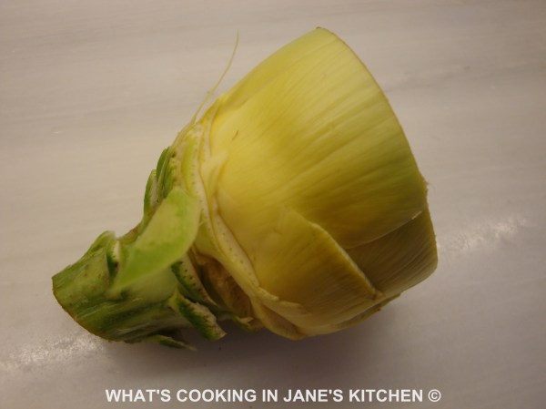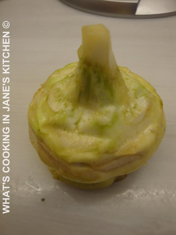3. Lastly peel your artichokes. Take the leaves off one by one, until the leaves are completely yellow in color and tender.Now cut top off artichoke, along the line of indentation, as in the picture. This is important, as the artichoke hearts are what we are aiming for and should melt in the mouth. So don’t feel you are waisting the artichokes by discarding so many leaves.There is nothing worse than chewy artichokes, the hearts should melt in the mouth!