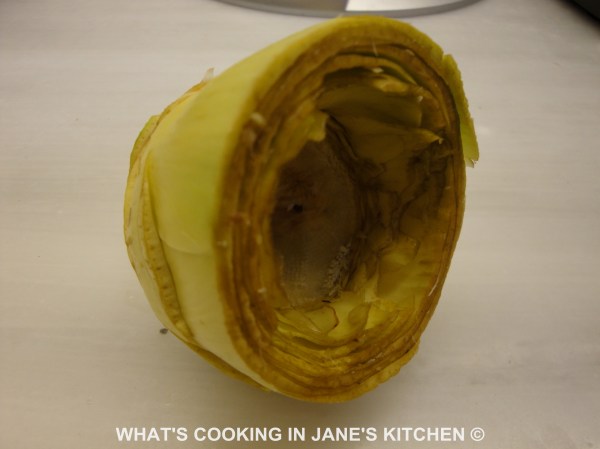 5. Using a sharp pointed knife initially and then with the aid of a sharp tea-spoon cut away the “choke”, leaving the center of the artichoke hollow. This part which remains is called the ” heart.”