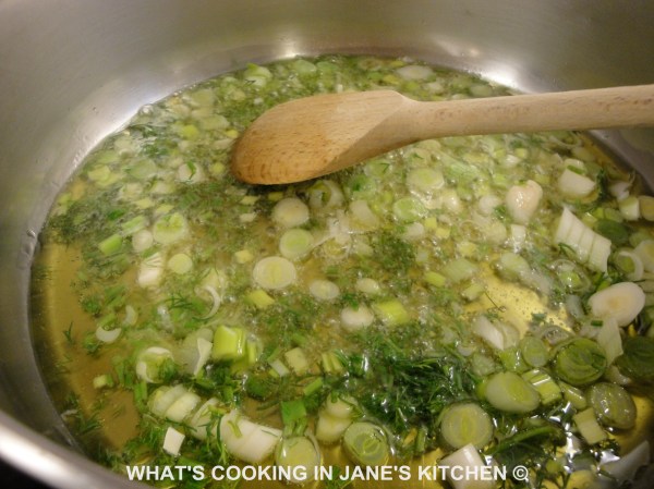 7.In a wide based saucepan, add olive oil, sliced spring onions, ( Only the white parts ) and only the stalks of the fennel finely chopped. Reserve the leaves in water, for later.