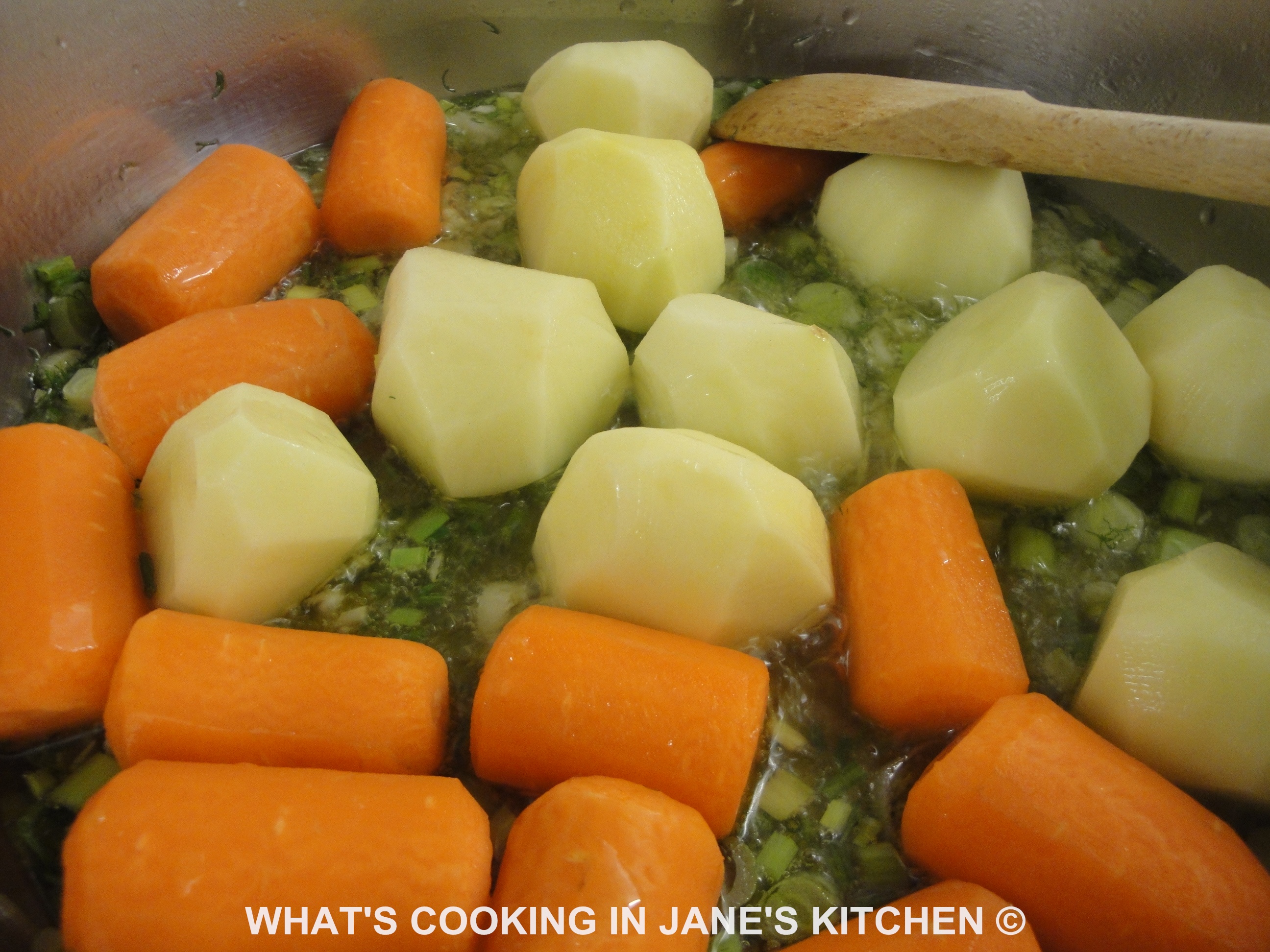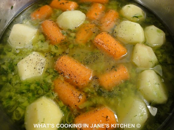 8. Saute for 2 minutes and then add your ‘turned’ vegetables, ( Potatoes and Carrots.) Saute over a medium heat for another 2 minutes. On no account let the vegetables brown at any time.