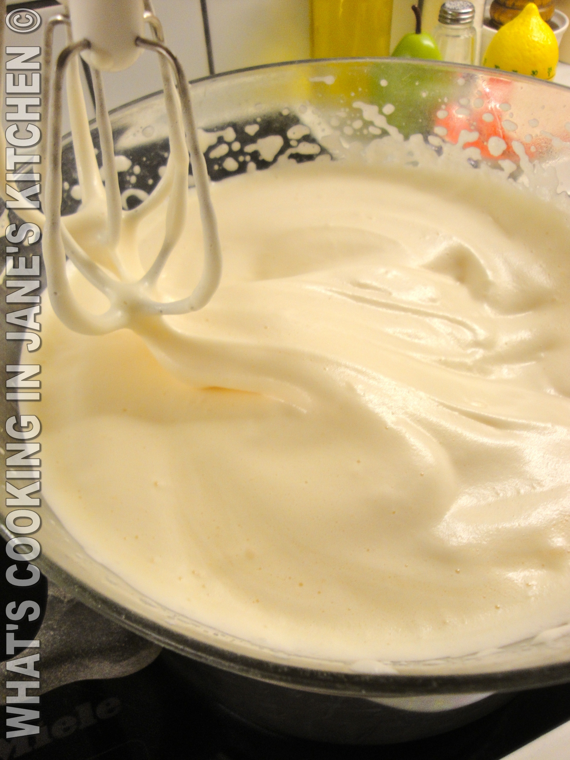 Beat for 5-7 minutes over saucepan of water that has boiled. See recipe. Beat until mixture leaves a trail.