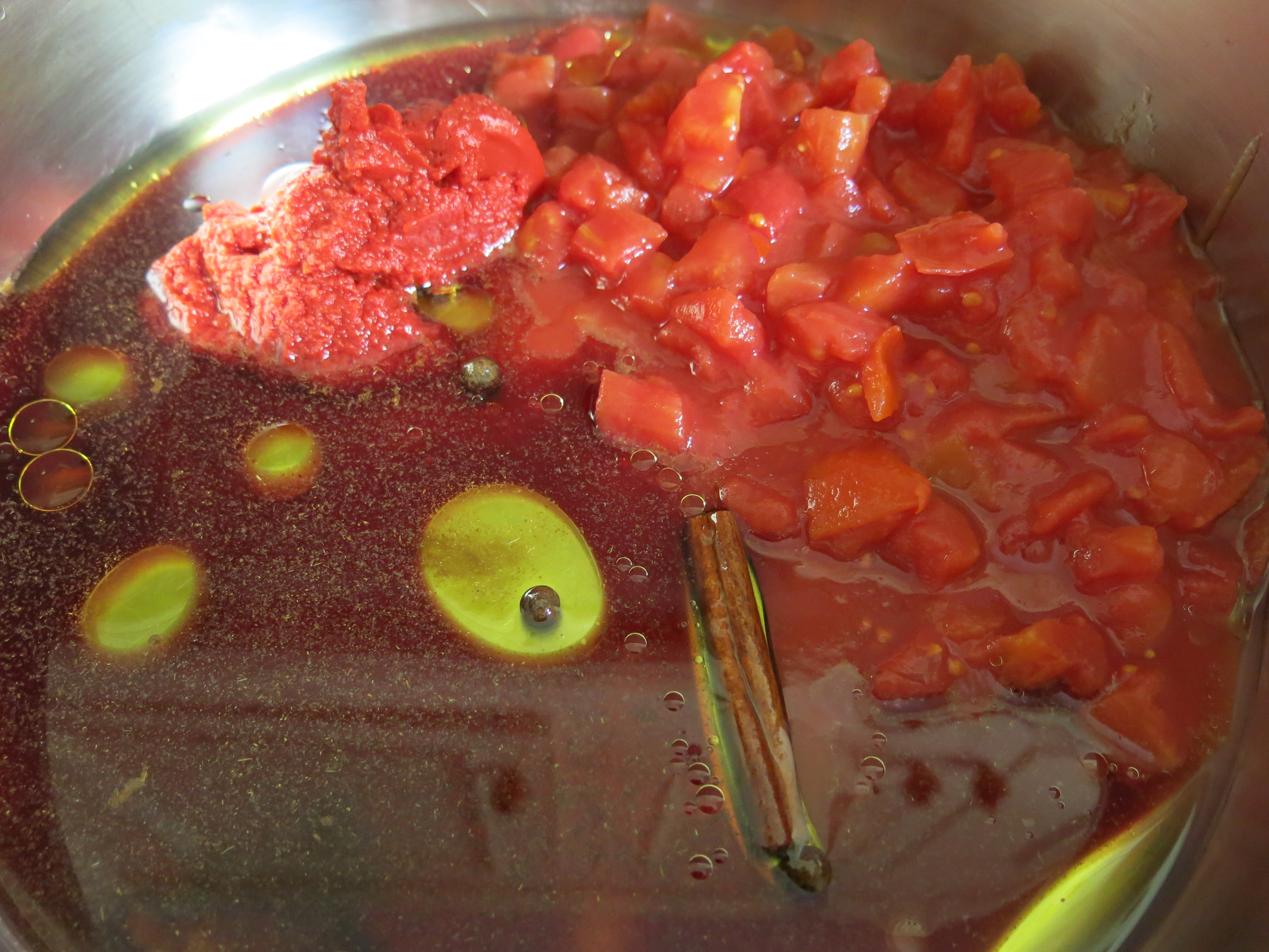 To spices and tomato puree, add wine and fresh or tinned tomatoes.