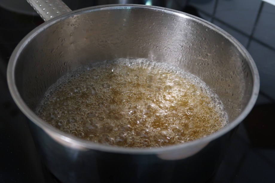 Once the colour reaches the colour of caramel, add almonds and pour out onto greased surface.